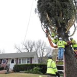 Workers prepare to cut down a 77-foot tall Norway Spruce that will serve as this year’s Rockefeller Center Christmas tree, Thursday, Nov. 7, 2019, in Florida, N.Y.