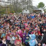 Students from local elementary schools cheer as this year’s Rockefeller Center Christmas tree, a 77-foot tall Norway Spruce, is cut, Thursday, Nov. 7, 2019, in Florida, N.Y.