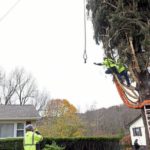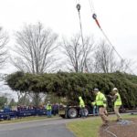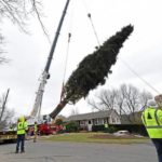 This year’s Rockefeller Center Christmas tree, a 77-foot tall Norway spruce, is craned onto a flatbed truck after being cut from the yard of Carol Schultz, Thursday, Nov. 7, 2019, in Florida, N.Y.