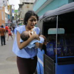 A Sri Lankan woman living near St. Anthony’s shrine runs for safety with her infant after police found explosive devices in a parked vehicle in Colombo, Sri Lanka, Monday, April 22, 2019. Easter Sunday bombings that ripped through churches and luxury hotels killed more than 200 people.