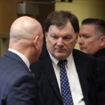 Rex A. Heuermann speaks with his lawyer Michael Brown during a court hearing where he was charged in the killing of Valerie Mack, inside Supreme Court Justice Timothy Mazzei’s courtroom at Suffolk County Court in Riverhead, N.Y.