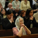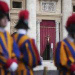 They made their way slowly to the main altar of the 16th-century St. Peter’s Basilica, where Francis’ simple wooden casket was perched on a slight ramp, as four Swiss Guards stood at attention.