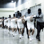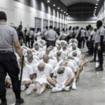 In this photo provided by El Salvador’s presidential press office, a prison guard transfers deportees from the U.S., alleged to be Venezuelan gang members, to the Terrorism Confinement Center in Tecoluca, El Salvador, Sunday, March 16, 2025.