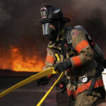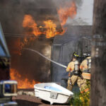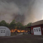 Video released by the state agency overseeing the fire service showed billowing white and black clouds of smoke, intense flames engulfing pines and firefighters dousing a charred structure.