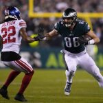 Take their divisional win over the Giants. Hurts threw to his 6-foot-5, 256-pound tight end on the game’s third play, and Goedert proceeded to plant New York cornerback Adoree’ Jackson with a stiff arm, helping to set the tone for the rest of the night. Goedert finished the drive with a touchdown catch to kick off the 38-7 rout.