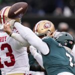 Purdy was drilled in the arm by Philadelphia Eagles linebacker Haason Reddick on a play that was ruled a fumble. The Eagles recovered and Purdy was examined on the sideline.
