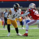 Nick Herbig (#51) was arguably the Steelers best defender on Sunday, gave Will Campbell a lot of problems with his speed. Sets him up outside then darts back in, forcing Maye to scramble into a Watt sack pic.twitter.com/1tmhULjrPm