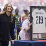 The St. Louis native, whose international career spanned 16 years, is a two-time Women’s World Cup winner and an Olympic gold medalist. Fans, who received a bobblehead in her image, gave her a standing ovation and chanted her name in a pregame ceremony.