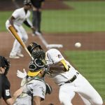 After Hayes singled off Erceg to start the sixth, the Pirates drew four consecutive walks. Richard Lovelady walked Mathias and Hedges to load the bases before the A’s turned to Shintaro Fujinami, whose first pitch was high and inside and sent McCutchen tumbling to the dirt.