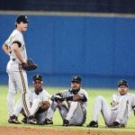 Pittsburgh Pirates, from left: Andy Van Slyke, Alex Cole, Jose Lind and Orlando Merced wait in the second inning during a delay in Game 7 of the National League Championship Series on Oct. 14, 1992, in Atlanta as home plate umpire John McSherry left the game ill.