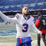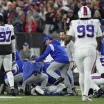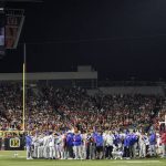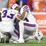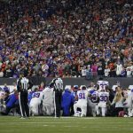 The Buffalo Bills players pray for teammate Damar Hamlin during the first half of an NFL football game against the Cincinnati Bengals, Monday, Jan. 2, 2023, in Cincinnati. The game has been postponed after Buffalo Bills’ Damar Hamlin collapsed, NFL Commissioner Roger Goodell announced.