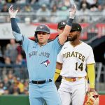 The Blue Jays responded by scoring five runs in the ninth, thanks to a pair of homers. Varsho blasted De Jong’s 1-2 slider 413 feet over the right-field seats for a two-run shot and a 7-1 lead. The ball bounced into the Allegheny River, the 68th time it’s happened but the first for a Blue Jays player and the first for any player this season.