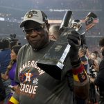Houston Astros manager Dusty Baker Jr. holds the trophy after their win against the Boston Red Sox in Game 6 of baseball’s American League Championship Series Friday, Oct. 22, 2021, in Houston. The Astros won 5-0, to win the ALCS series in game six.