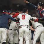 Atlanta Braves celebrate after winning Game 6 of baseball’s National League Championship Series against the Los Angeles Dodgers Sunday, Oct. 24, 2021, in Atlanta. The Braves defeated the Dodgers 4-2 to win the series.