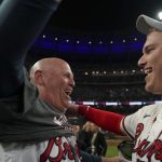 Atlanta Braves manager Brian Snitker celebrates with Joc Pederson after winning Game 6 of baseball’s National League Championship Series against the Los Angeles Dodgers Sunday, Oct. 24, 2021, in Atlanta. The Braves defeated the Dodgers 4-2 to win the series.