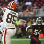 Browns tight end David Njoku makes a catch against the Falcons during the first half Sunday, Oct. 2, 2022, in Atlanta.