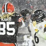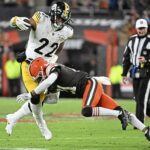The Steelers created a turnover early in the third quarter on a 24-yard pass to Cedric Tillman when strong safety DeShon Elliott’s tackle forced a fumble that was recovered by cornerback Donte Jackson at the Pittsburgh 25. The Steelers went for it on fourth-and-1 at their own 46, only for Browns defensive tackle Maurice Hurst II to stuff Jaylen Warren for a 1-yard loss.