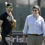 Pirates center fielder Bryan Reynolds talks with owner Bob Nutting during a workout on Thursday, March 17, 2022, at LECOM Park in Bradenton, Fla. Reynolds and the Pirates couldn’t come to a settlement to avoid arbitration so they will have a hearing to determine his salary this season.