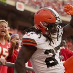 The Browns twice converted fourth downs in the Chiefs’ red zone to keep first-half scoring drives alive. Chubb ended the first with his first TD run, and Jarvis Landry scored on fourth down on the second, before Chubb tacked on an 18-yard run through a gaping hole in the rebuilt Chiefs defensive line to make it 22-10 at halftime.
