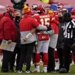 Mahomes, already hobbled by a foot injury, stumbled as he tried to get to his feet. He was eventually helped to the blue tent on the sideline, then ran to the locker room, where he was evaluated for a concussion.