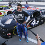 Wallace wore a black shirt bearing the words “I can’t breathe” and “black lives matter” at the race and had his car decorated accordingly, including “#blacklivesmatter,” “compassion, love, understanding,” and a black hand clasping a white hand on the hood.