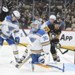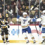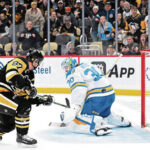 After Karlsson lost a puck at St. Louis’ blue line, Blues forward Brayden Schenn claimed it and initiated a rush into the Penguins’ zone on the left wing. With Letang applying pressure, Schenn fed a pass from the left dot to the far side of the crease, where Kyrou tapped in a forehand shot behind a breakdancing Jarry. Schenn and forward Dylan Holloway had assists.