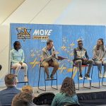 Runners (from left) Nick Wolk, Caroline Rotich, Wesley Kiptoo and Margo Malone on stage during a Q&A speak at a press conference ahead of the 2023 Pittsburgh Marathon on May 5, 2023, at the David L. Lawrence Convention Center.