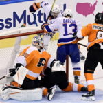 The Flyers withstood another New York push in the second and Giroux scored late, redirecting a shot by Phil Myers through Varlamov’s legs for his first goal in 26 playoff games.