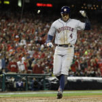 Astros outfielder George Springer celebrates after scoring on a single by Yuli Gurriel during the eighth inning of Game 5 of the World Series against the Washington Nationals on Sunday, Oct. 27, 2019, in Washington.