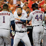 Houston’s Carlos Correa celebrates with teammates after his two-run homer against the Washington Nationals during the fourth inning of Game 5 of the World Series.