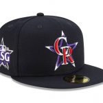 Caps have team logos mostly in red, with some white and blue, superimposed over a star in the Rockies’ purple with white points.