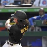 Pirates shortstop Cole Tucker loses his bat on a swing during the sixth inning against the Cubs on Tuesday, May 25, 2021, at PNC Park.