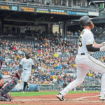 Pirates third baseman Colin Moran watches his grand slam during the first inning of the 2018 home opener against the Twins on Monday, April 2, 2018.