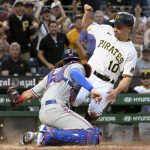 McCutchen raced to third on Suwinski’s single to right-center but with two outs and Hayes at bat, the Pirates attempted a double steal. Heim’s throw to Marcus Semien at second stopped Suwinski between the bases, and McCutchen was caught heading home and froze as Semien ran in to tag him for the final out.