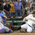 Carlos Santana singled to right but Adolis Garcia threw home to catcher Jonah Heim, who swiped across the plate to tag a sliding Reynolds. Home plate umpire Nate Tomlinson called Reynolds out, but the Pirates challenged and it was overturned after a video review.