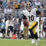 Pittsburgh Steelers quarterback Mitch Trubisky scrambles for yardage during the first half of a preseason game against the Jacksonville Jaguars, Saturday, Aug. 20, 2022, in Jacksonville, Fla.