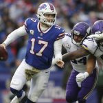 With the Bills ahead 27-17, Allen threw his first interception on fourth-and-goal at Minnesota’s 2 with 10:27 remaining. Rolling to his right, Allen inexplicably threw back across his body directly to Peterson, who returned the ball to Buffalo’s 34 and was tackled by Allen. The frustrated quarterback lay face down on the field for nearly a minute, and kicked both of his feet on the turf before finally getting up.