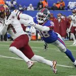New York’s defense set up Hodgins’ first NFL touchdown early in the second half for a 20-13 lead. Azeez Ojulari sacked Heinicke and forced a fumble. Oshane Ximines recovered but also fumbled, and Ojulari ultimately collected the ball at the Washington 20.