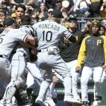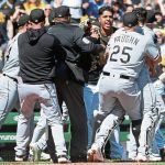 Pirates pitcher Johan Oviedo goes after White Sox catcher Seby Zavala after a play at the plate during the sixth inning on Sunday, April 9, 2023, at PNC Park.
