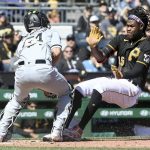 Pirates right fielder Canaan Smith-Njigba scores during the second inning against the White Sox on Sunday, April 9, 2023, at PNC Park.