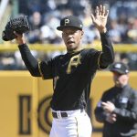 Pirates pitcher Johan Oviedo celebrates as he exits the game during the seventh inning against the White Sox on Sunday, April 9, 2023, at PNC Park.