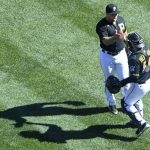 Pirates closer David Bednar celebrates with catcher Tyler Heineman after defeating the White Sox on Sunday, April 9, 2023, at PNC Park.