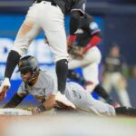 The streak was broken and the Marlins scored their first run when Derek Hill reached base on an infield single to third base — an out call was overturned on review — and scored on Graham Pauley’s double into the right-field corner.