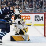 Off a bit of give-and-go with Penguins forward Evgeni Malkin, Penguins defenseman Erik Karlsson smacked a one-timer from the center point of Winnipeg’s zone. The puck appeared to be going wide, but with Crosby positioned to the right of the crease, the puck hit his stick and deflected in behind goaltender Eric Comrie’s glove. Karlsson and Malkin merited assists.