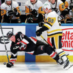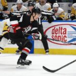 Entering the offensive zone on the right wing, Sabres forward Alex Tuch chipped a pass to the near circle for Sabres forward Tage Thompson. Fighting off Penguins defenseman P.O Joseph, Thompson used his 6-foot-6 frame to slip a pass across the front of the crease. Getting a step on a backchecking Rakell, Benson chopped a forehand shot over a scrambling Nedeljkovic. Thompson and Tuch had assists.
