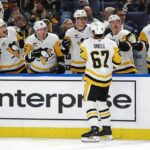 From the right point of Buffalo’s zone, Penguins defenseman Matt Grzelcyk fed a forehand pass to the lower right circle for forward Bryan Rust, who one-touched the puck to the upper portions of the circle, allowing Rakell to lean on his right knee and rip a one-timer to the far side, beating goaltender Ukko-Pekka Luukkonen’s blocker. Penguins forward Michael Bunting supplied a screen on the sequence. Rust and Grzelcyk generated assists.