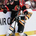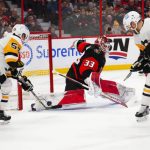 Taking a pass at the left point of the Senators’ zone, Crosby chopped a pass to the slot for Rakell, who had to knock the puck down with his stomach. Spinning backward, Rakell whipped a wrister that squeaked through Talbot’s gear and leaked into the cage for his 16th goal. Crosby and Malkin tallied assists.