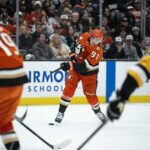 Off a line change, Crosby chugged off the visiting bench and into the offensive zone on the left wing with the puck to create a two-on-one with Mantha against Ducks defenseman Olen Zellweger, who opted to devote his focus on the puck carrier. Crosby accepted that charity and fed a pass to a wide open Mantha, who stopped the puck and then whipped a wrister on net. Ducks defenseman Jacob Trouba hustled back in hopes of blocking the shot, only to have the puck break his stick and hop over Dostal’s left shoulder on the near side. Crosby and linemate Bryan Rust registered assists.