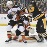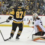Working with an extra attacker, Pettersson was deep in the Ducks’ right corner and corralled a rebound then tapped a backhand pass to Rakell behind the cage. From there, Rakell one-touched another backhand pass to the right of the crease, where Guentzel fended off Ducks defenseman Cam Fowler and forward Sam Carrick then distributed his own backhand pass to the left circle, where Rust leaned down and fired a wrister under Gibson’s blocker on the near side. Guentzel and Rakell recorded assists.
