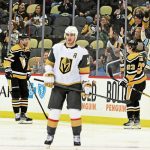 From the center point of the offensive zone, Golden Knights defenseman Shea Theodore surveyed for a shooting lane and snapped off a wrister through a narrow avenue down the slot. Battling Stone above the blue paint, Penguins defenseman Jan Rutta tumbled to the ice as the puck appeared to glance off of his left leg and deflect by Jarry’s glove. Theodore was credited with his fourth goal off assists from forward Chandler Stephenson and Eichel.